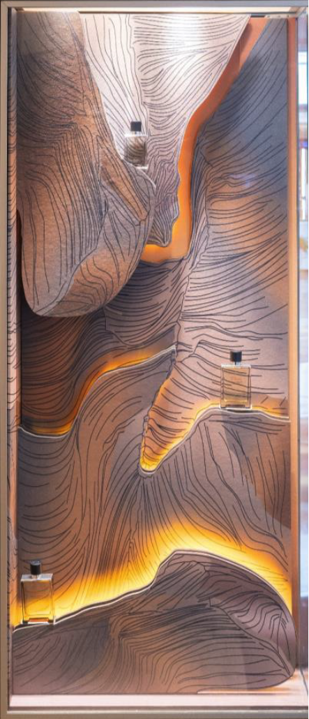 For this year’s Terre d’Hermès Intense windows, we explore the contrast between vast landscapes and intimate spaces, inviting the Hermès man on a journey both outward and inward.