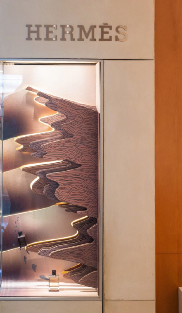 For this year’s Terre d’Hermès Intense windows, we explore the contrast between vast landscapes and intimate spaces, inviting the Hermès man on a journey both outward and inward.